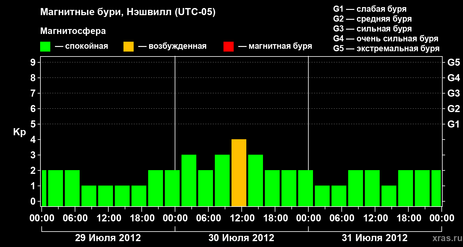 Изменения геомагнитного индекса Kp с 29 по 31 июля 2012 года для средних широт