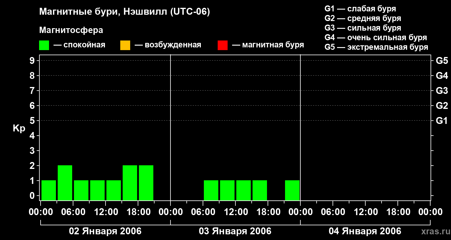 Изменения геомагнитного индекса Kp с 2 по 4 января 2006 года для средних широт
