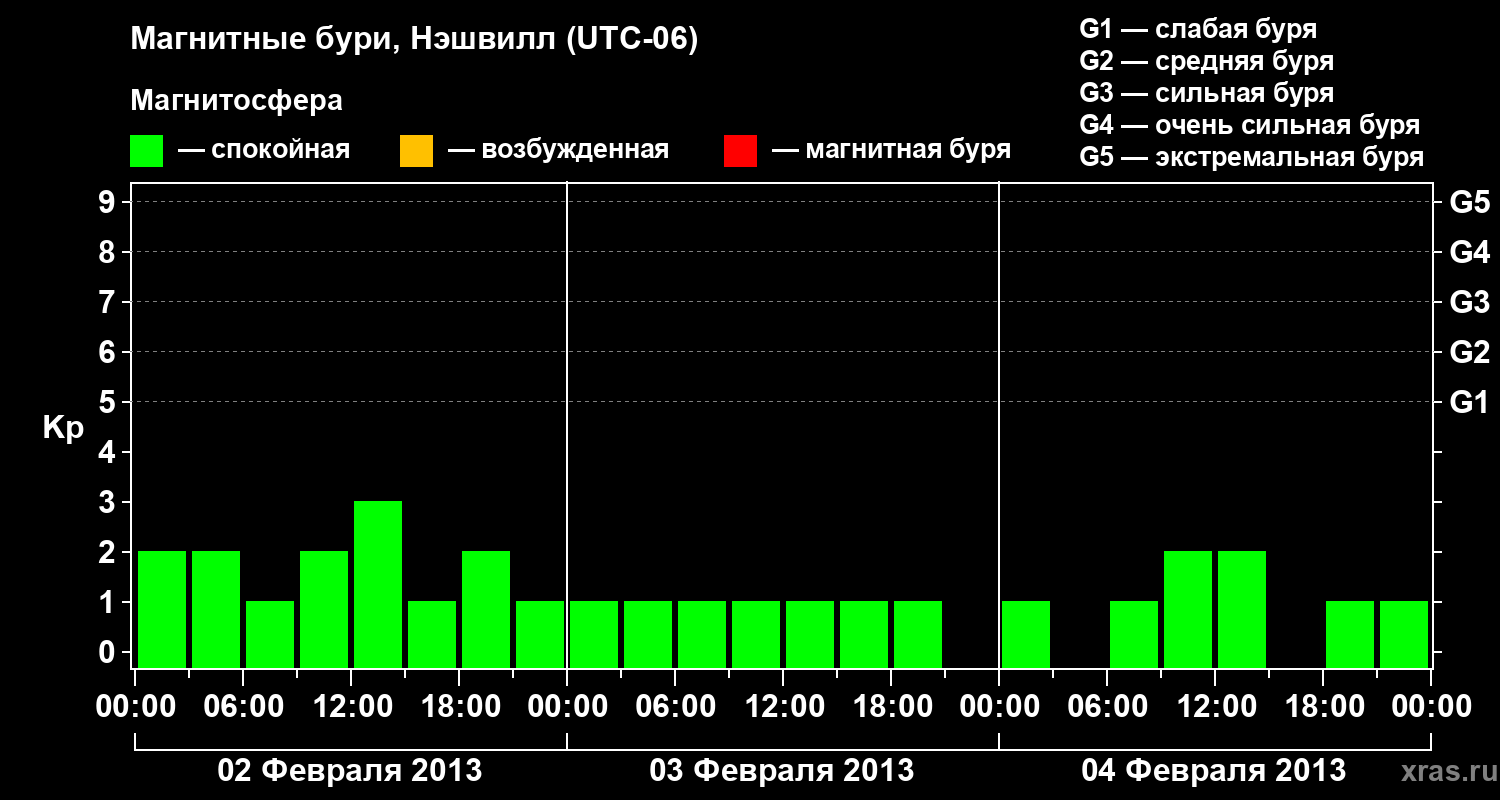 Изменения геомагнитного индекса Kp с 2 по 4 февраля 2013 года для средних широт