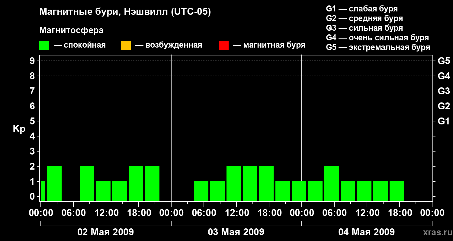 Изменения геомагнитного индекса Kp с 2 по 4 мая 2009 года для средних широт