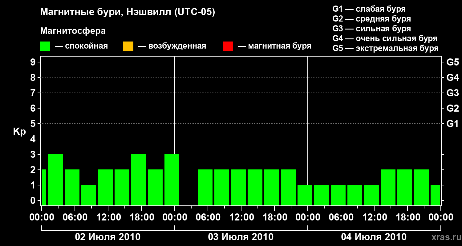 Изменения геомагнитного индекса Kp с 2 по 4 июля 2010 года для средних широт