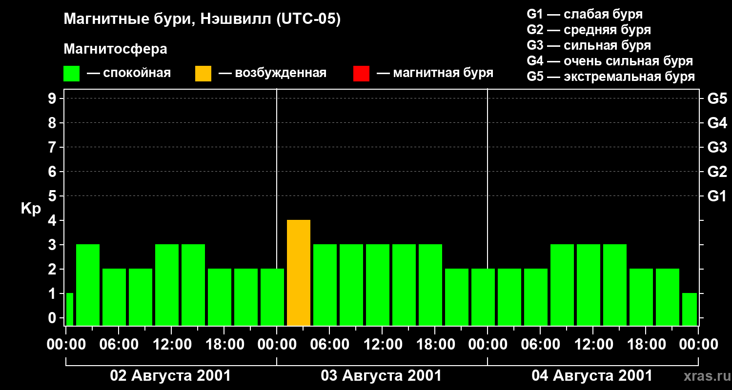 Изменения геомагнитного индекса Kp с 2 по 4 августа 2001 года для средних широт