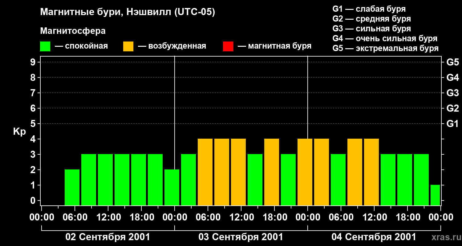 Изменения геомагнитного индекса Kp с 2 по 4 сентября 2001 года для средних широт