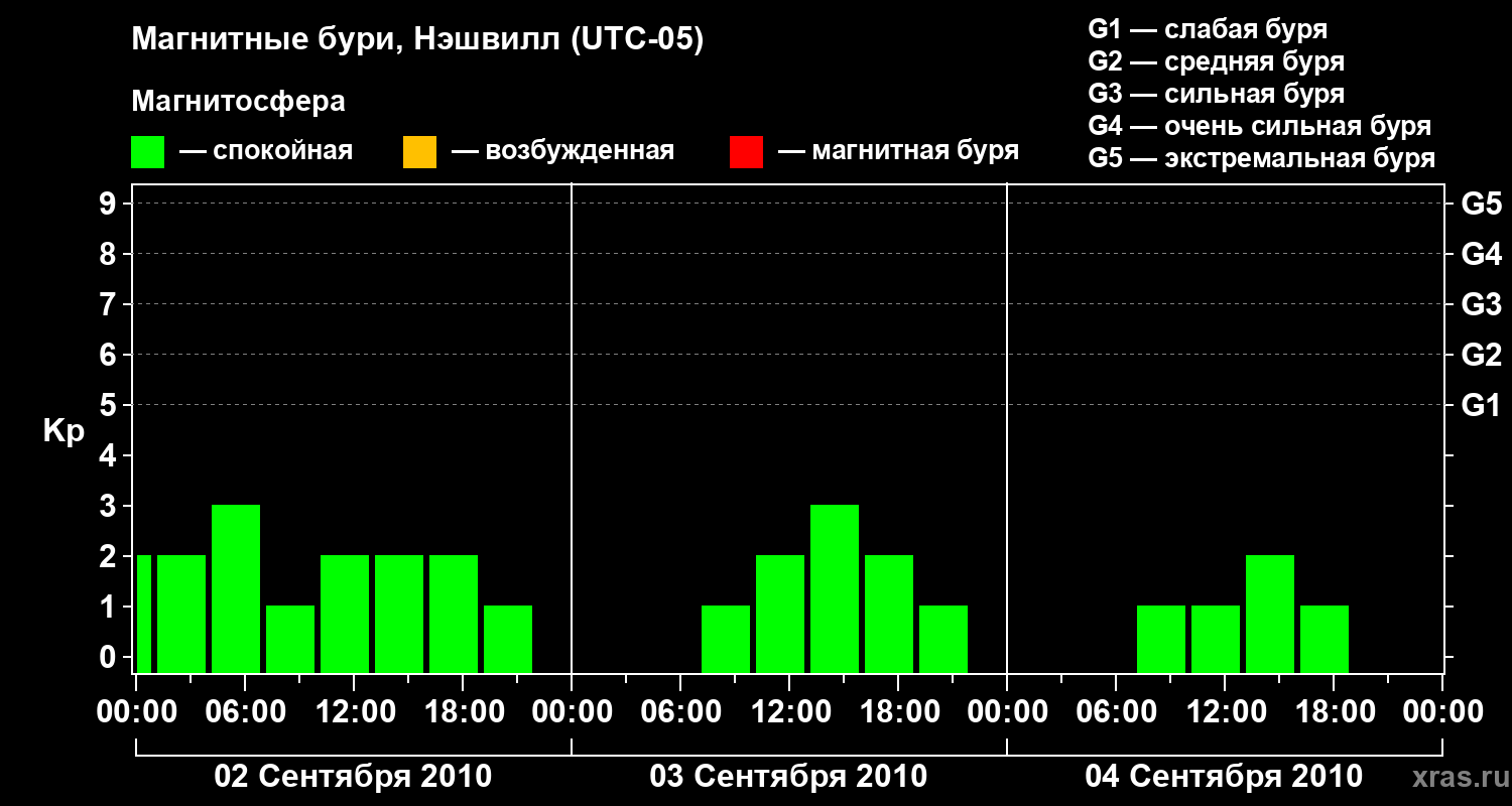 Изменения геомагнитного индекса Kp с 2 по 4 сентября 2010 года для средних широт