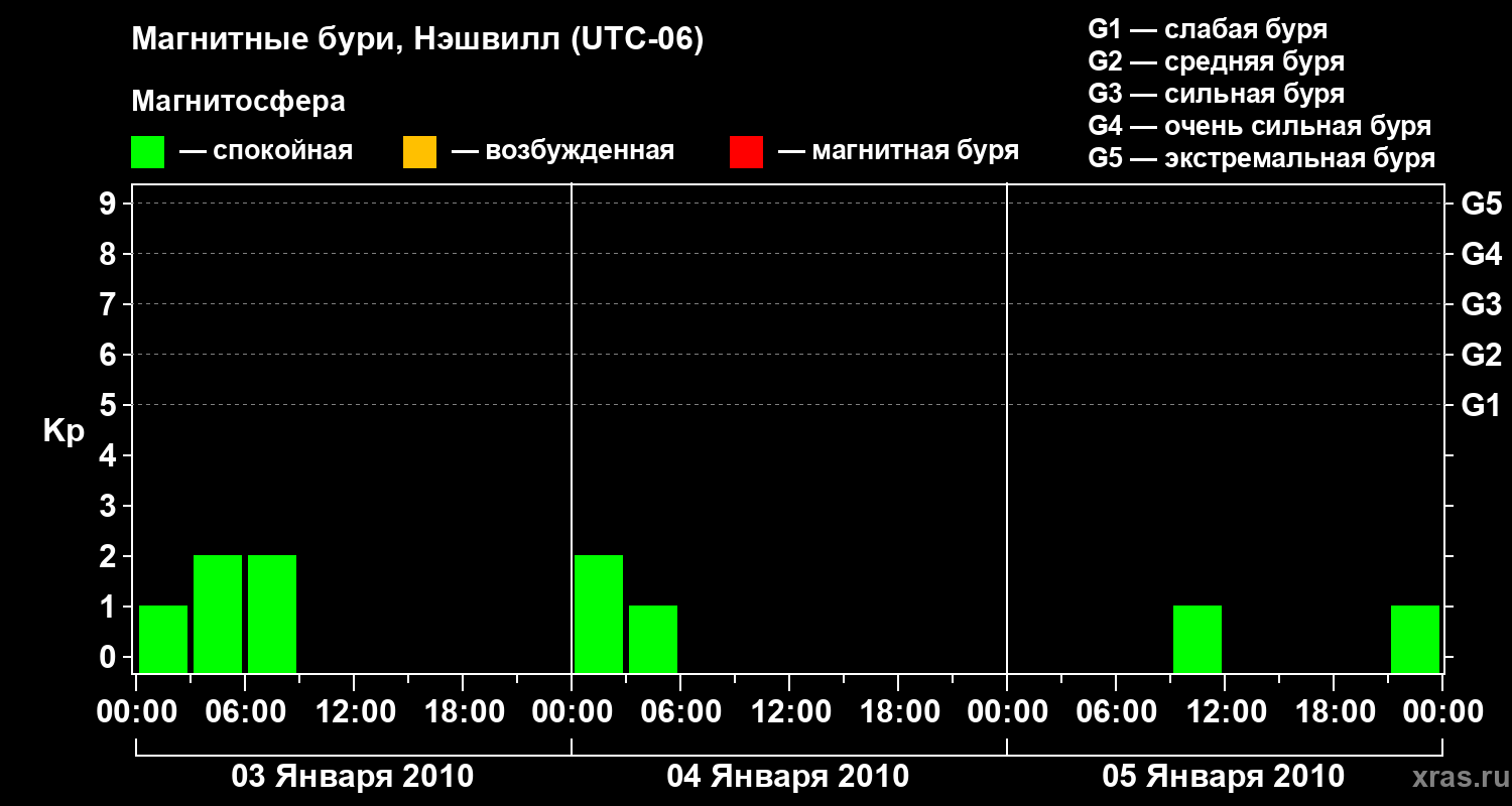 Изменения геомагнитного индекса Kp с 3 по 5 января 2010 года для средних широт