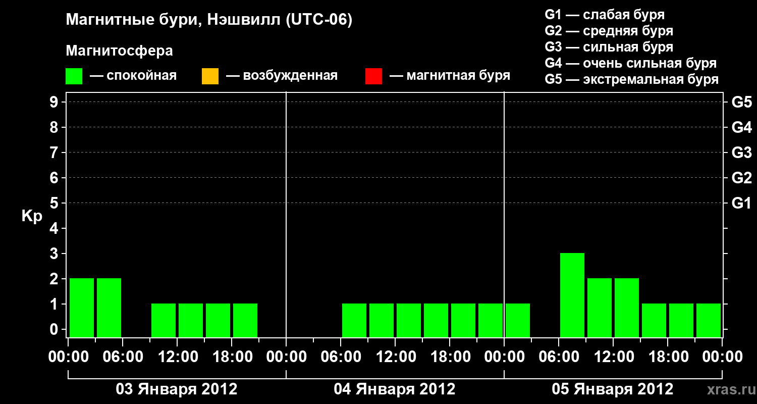 Изменения геомагнитного индекса Kp с 3 по 5 января 2012 года для средних широт