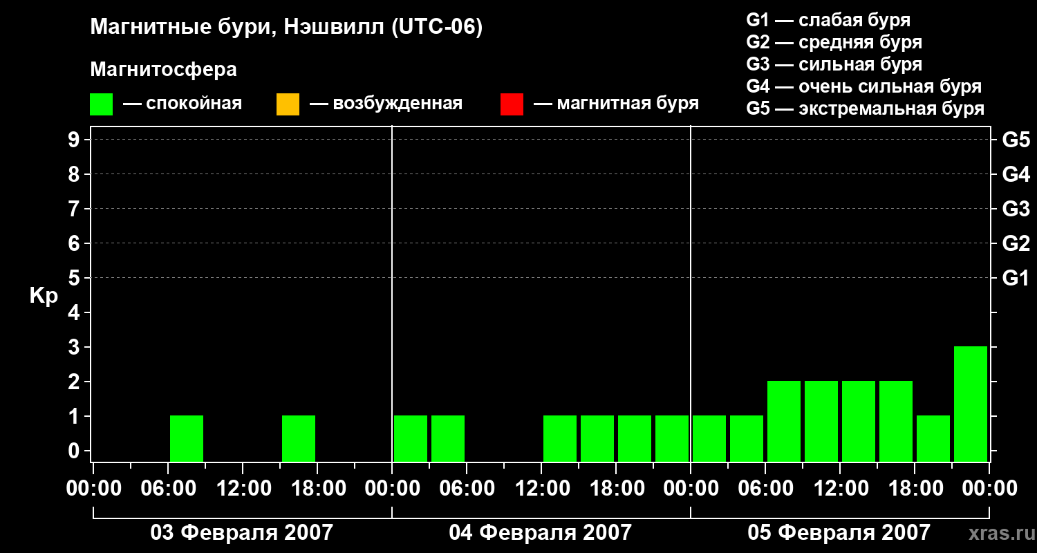 Изменения геомагнитного индекса Kp с 3 по 5 февраля 2007 года для средних широт