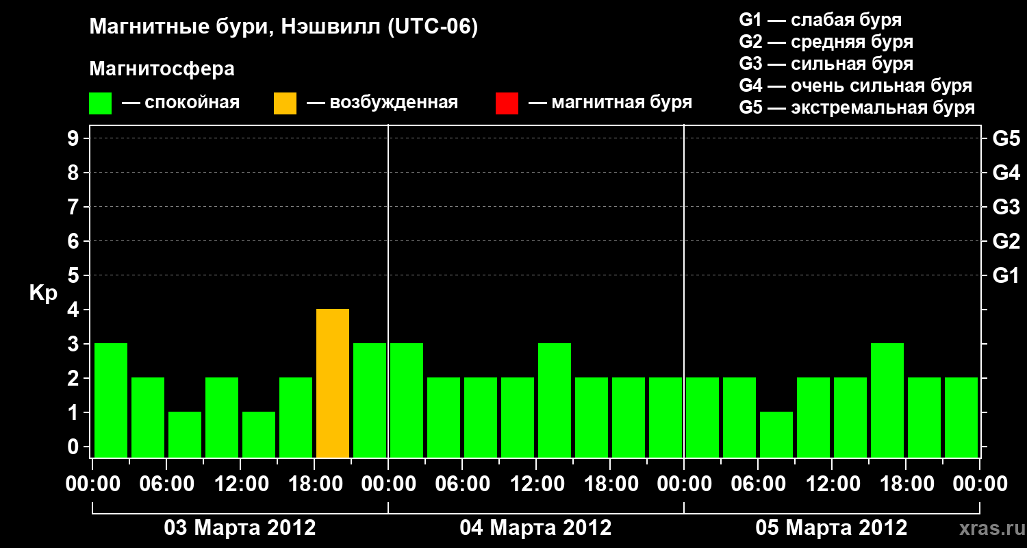 Изменения геомагнитного индекса Kp с 3 по 5 марта 2012 года для средних широт