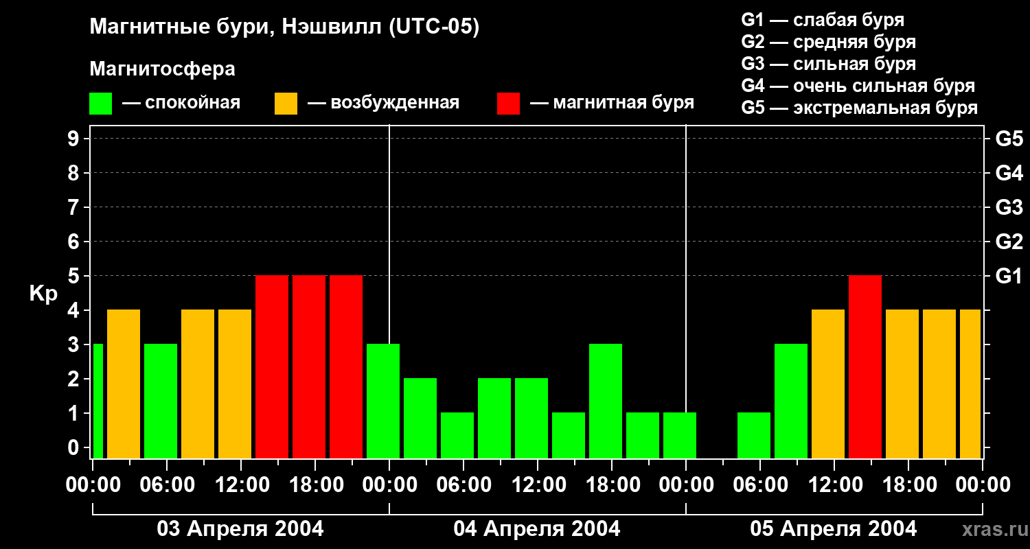 Изменения геомагнитного индекса Kp с 3 по 5 апреля 2004 года для средних широт