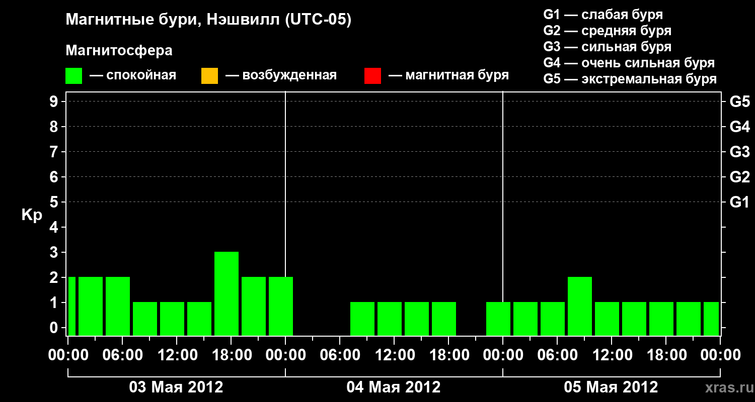 Изменения геомагнитного индекса Kp с 3 по 5 мая 2012 года для средних широт