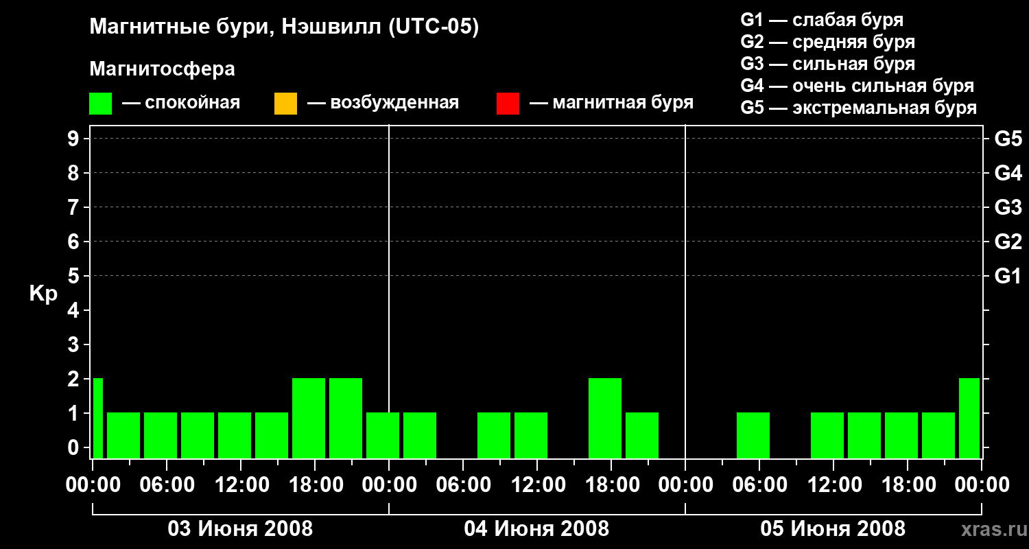 Изменения геомагнитного индекса Kp с 3 по 5 июня 2008 года для средних широт