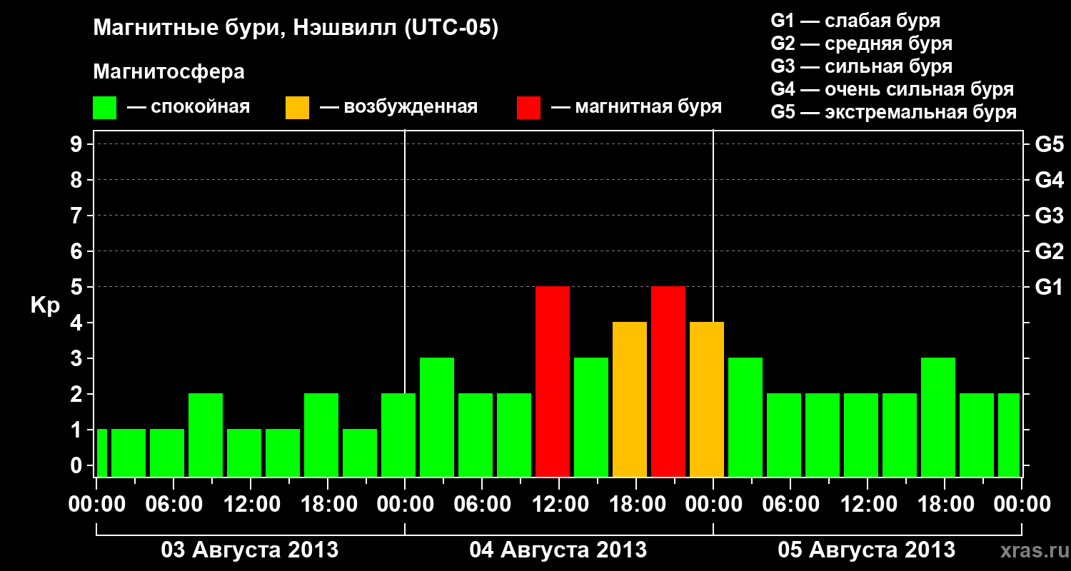 Изменения геомагнитного индекса Kp с 3 по 5 августа 2013 года для средних широт