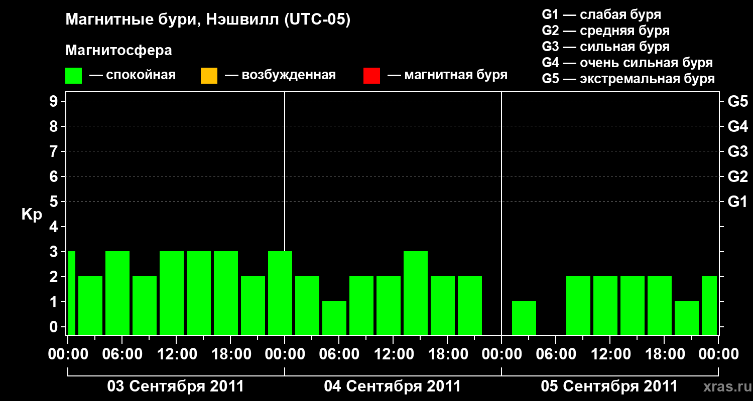 Изменения геомагнитного индекса Kp с 3 по 5 сентября 2011 года для средних широт