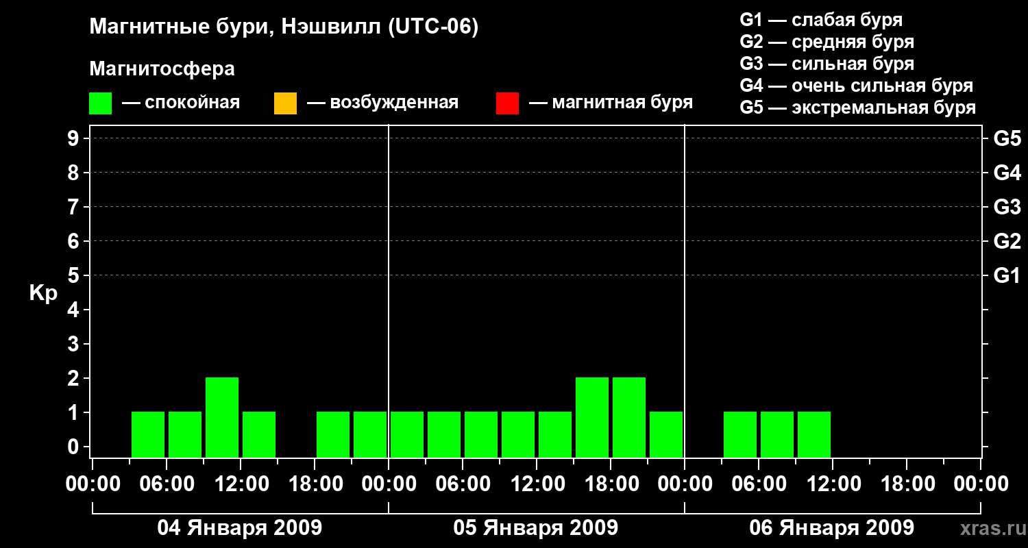 Изменения геомагнитного индекса Kp с 4 по 6 января 2009 года для средних широт