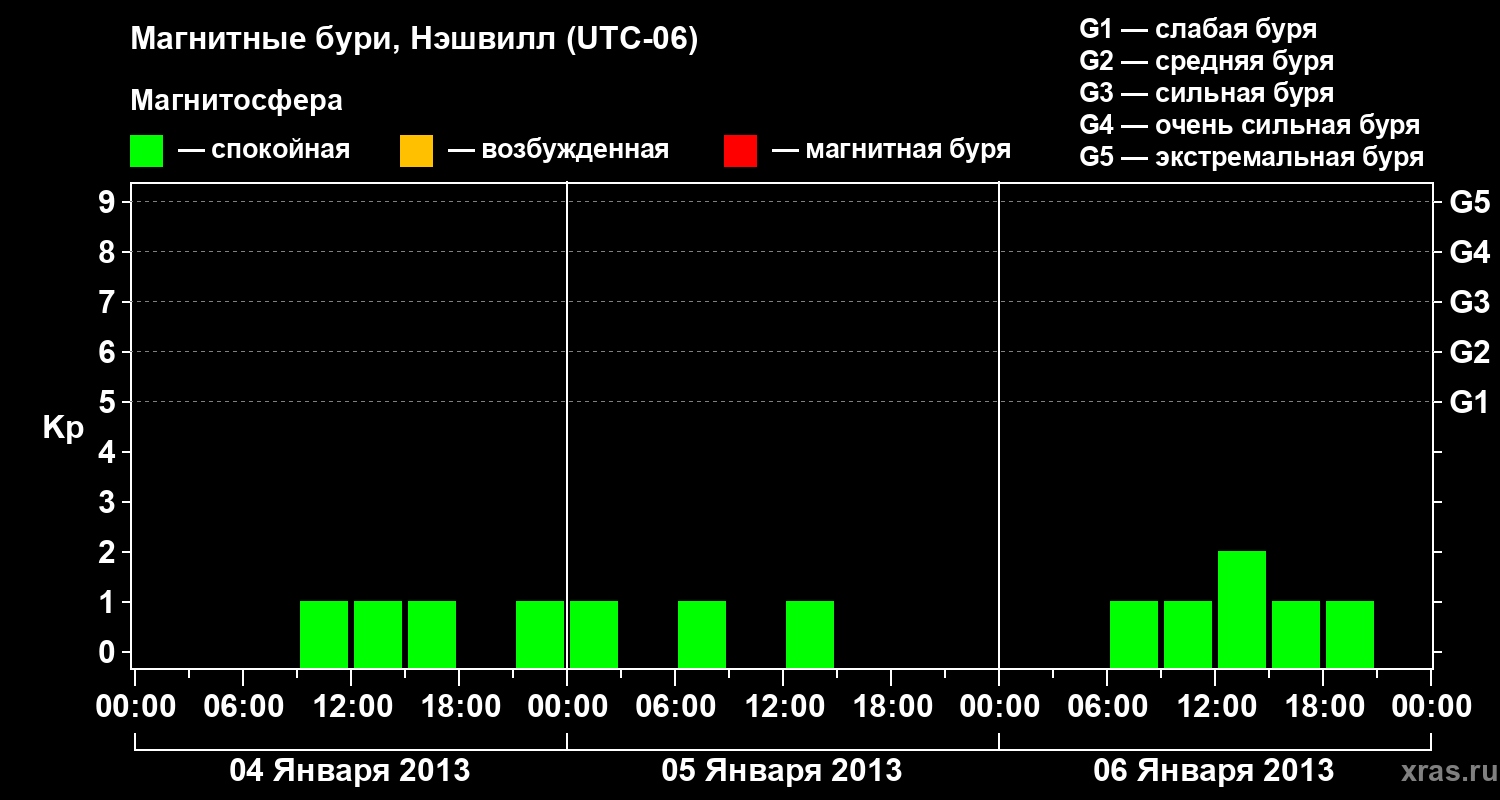 Изменения геомагнитного индекса Kp с 4 по 6 января 2013 года для средних широт