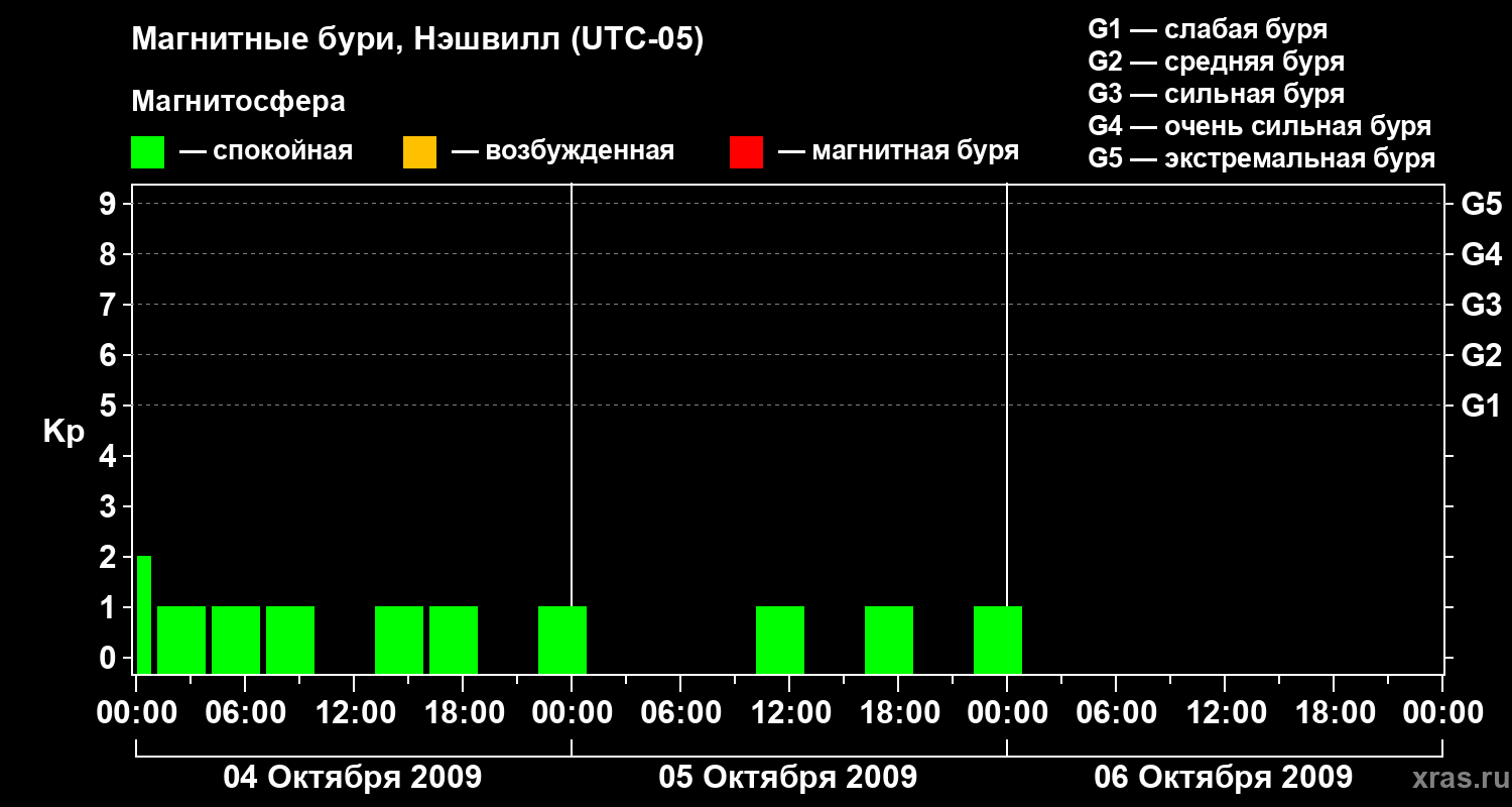 Изменения геомагнитного индекса Kp с 4 по 6 октября 2009 года для средних широт