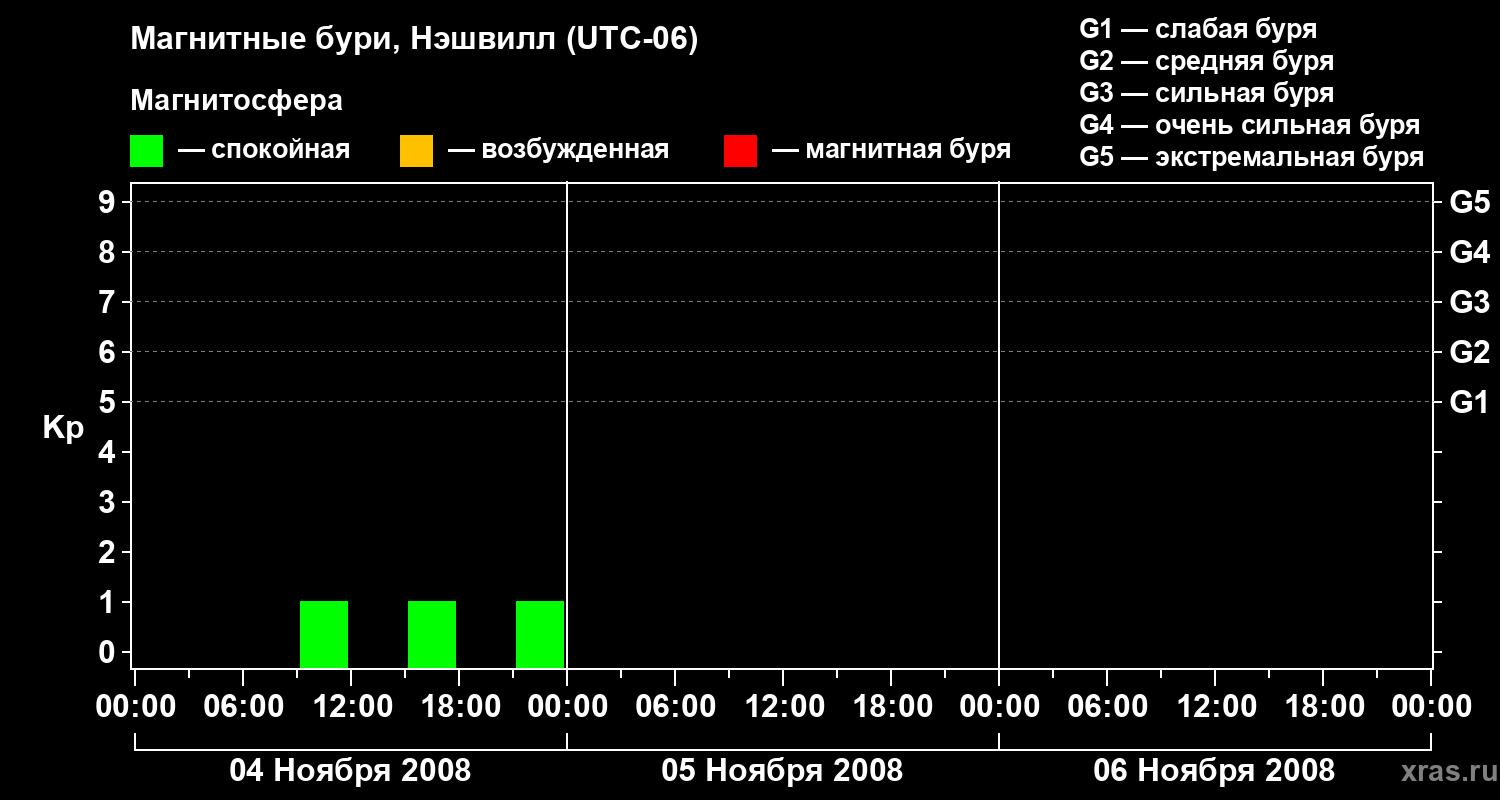 Изменения геомагнитного индекса Kp с 4 по 6 ноября 2008 года для средних широт