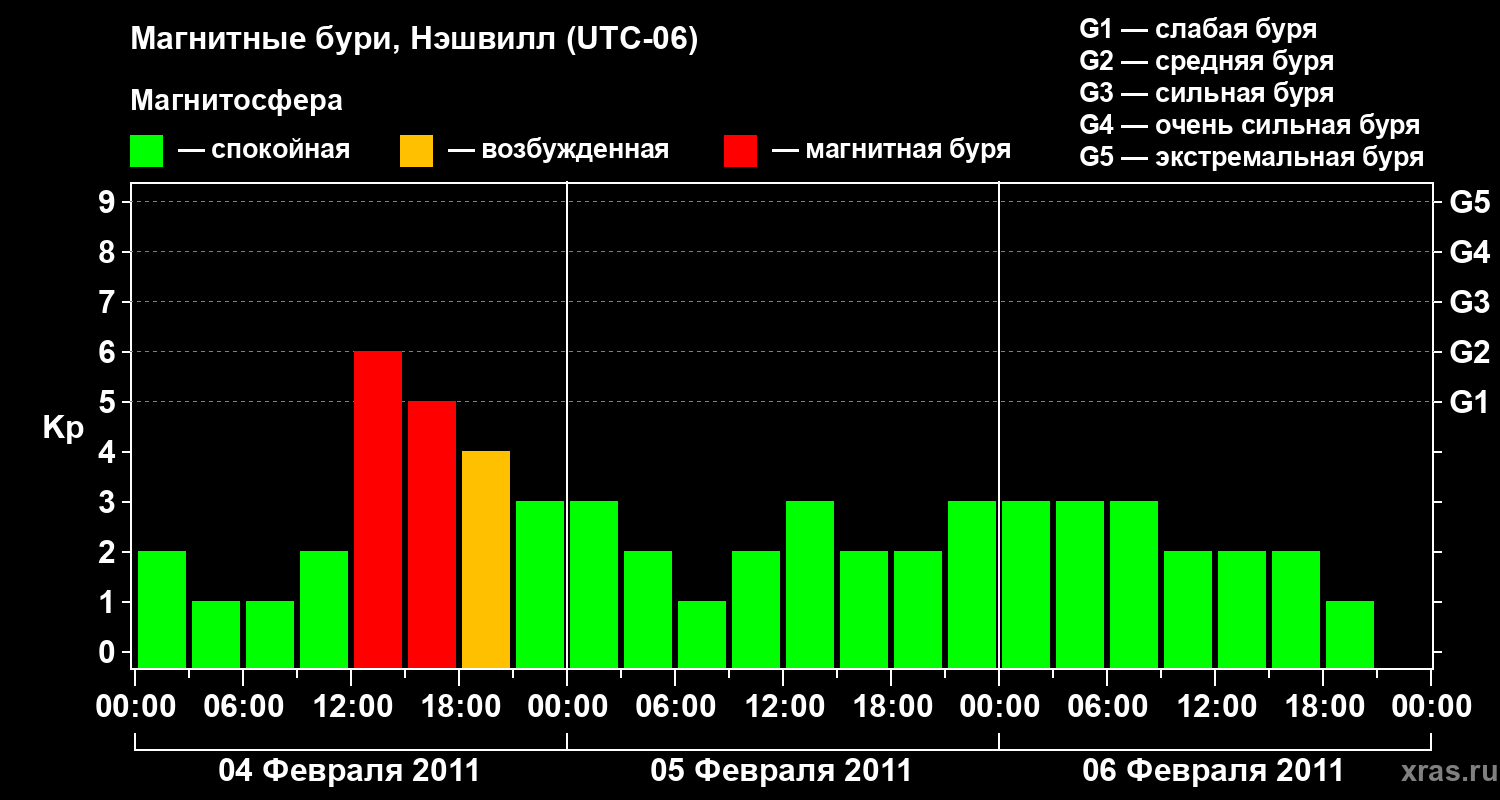 Изменения геомагнитного индекса Kp с 4 по 6 февраля 2011 года для средних широт