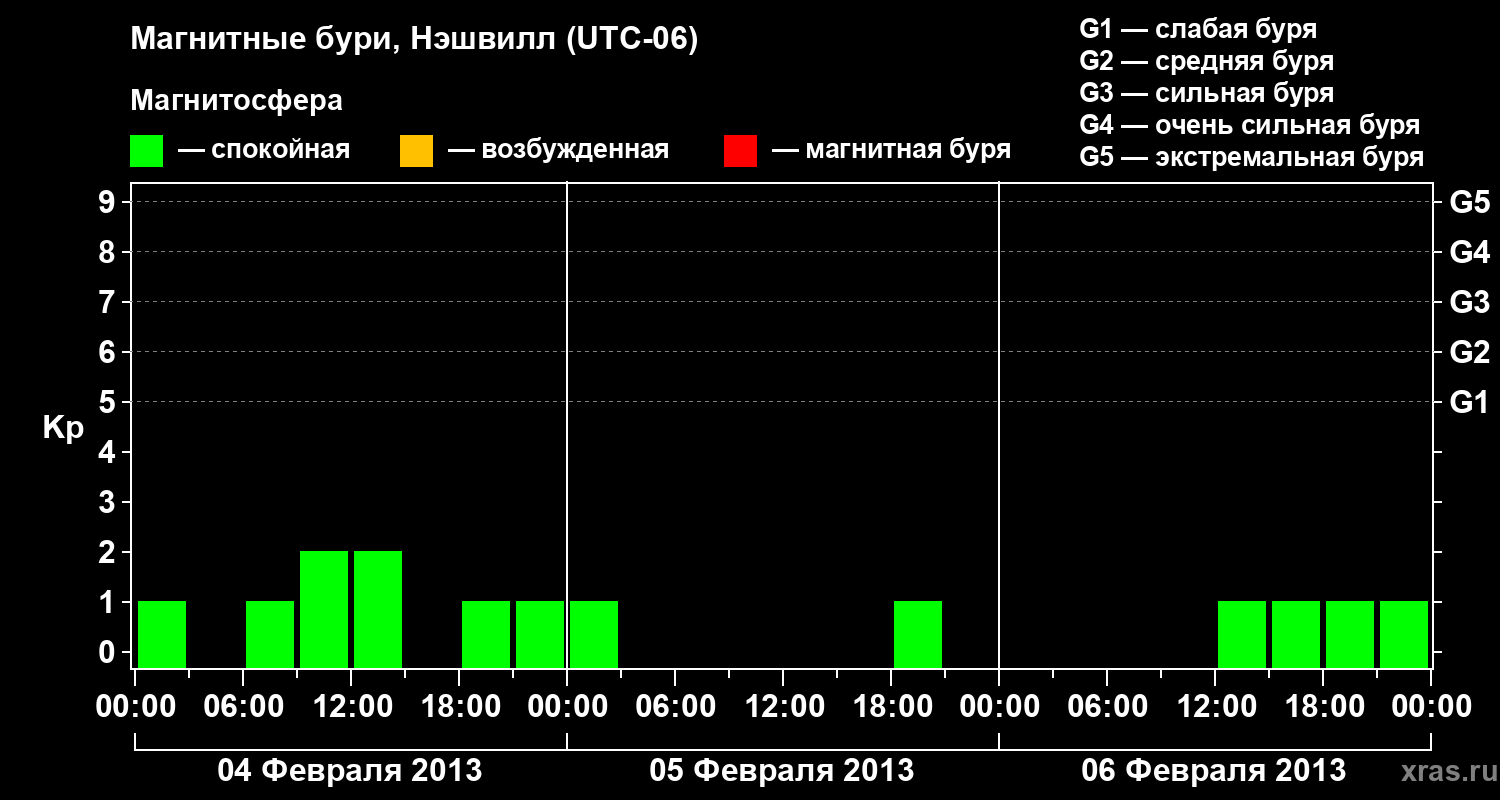 Изменения геомагнитного индекса Kp с 4 по 6 февраля 2013 года для средних широт