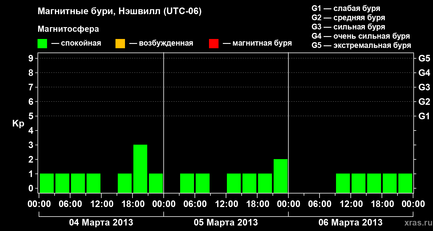 Изменения геомагнитного индекса Kp с 4 по 6 марта 2013 года для средних широт