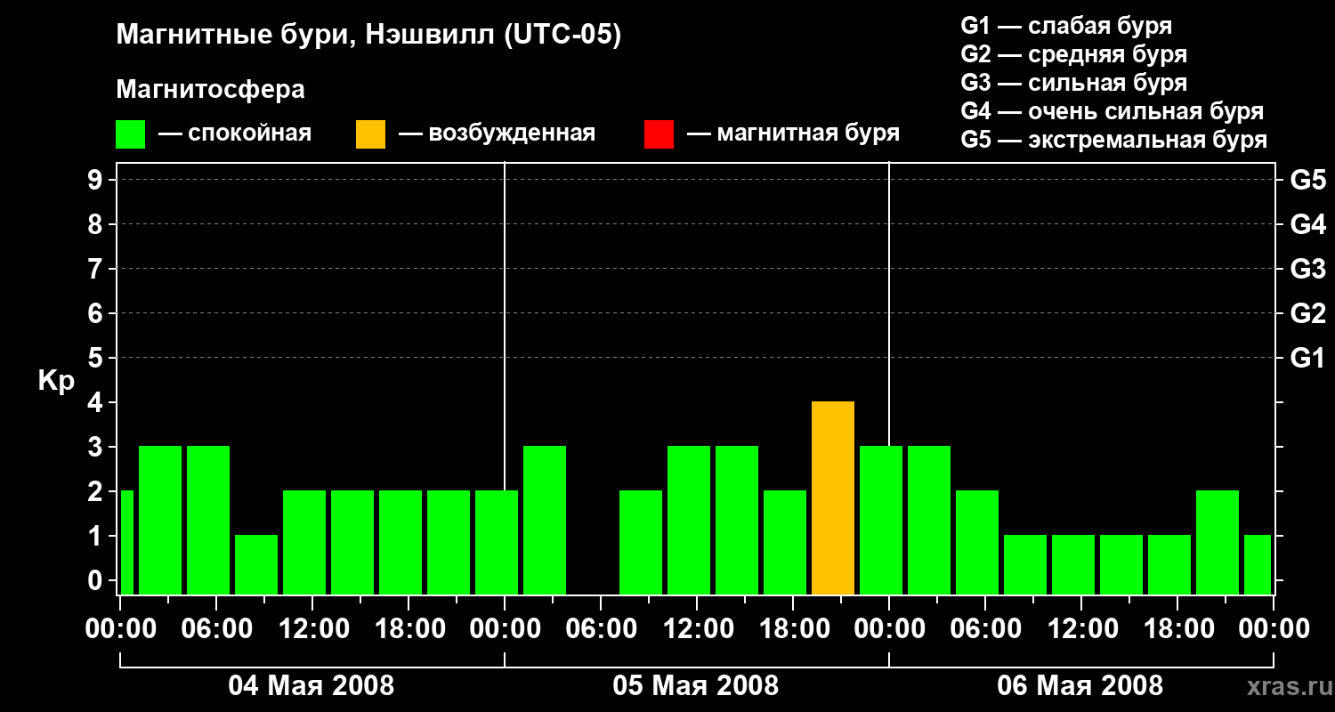 Изменения геомагнитного индекса Kp с 4 по 6 мая 2008 года для средних широт