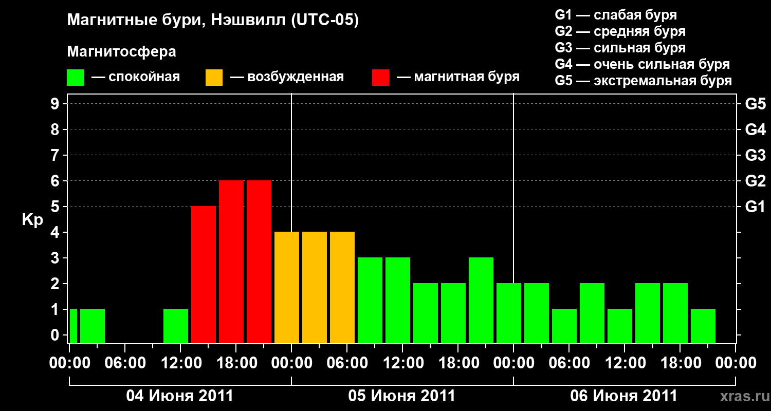 Изменения геомагнитного индекса Kp с 4 по 6 июня 2011 года для средних широт