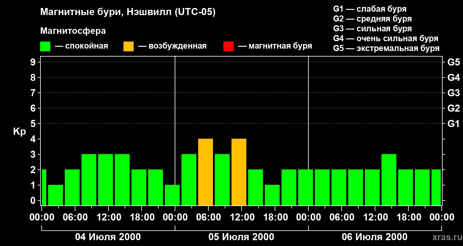 Изменения геомагнитного индекса Kp с 4 по 6 июля 2000 года для средних широт