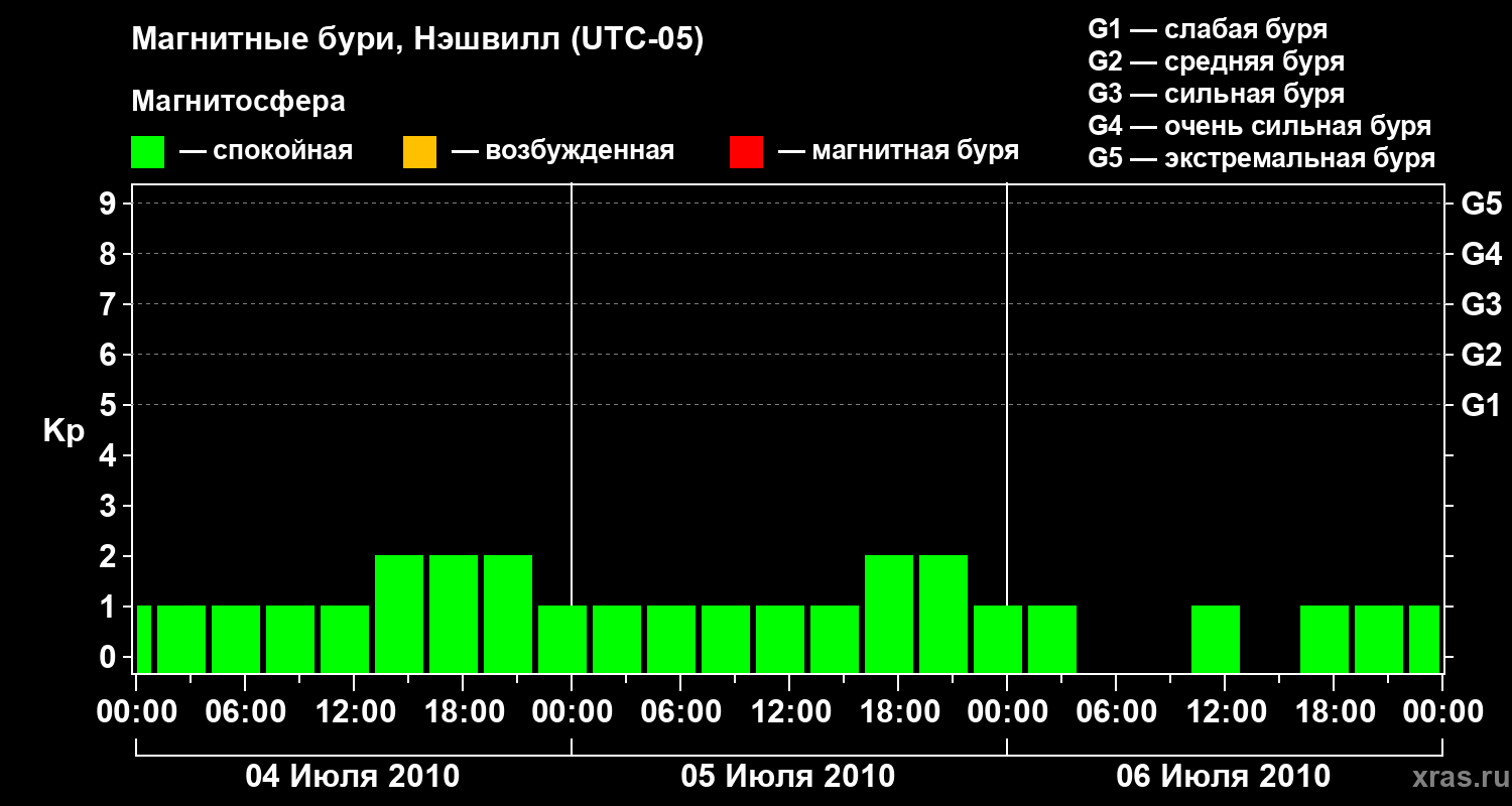 Изменения геомагнитного индекса Kp с 4 по 6 июля 2010 года для средних широт
