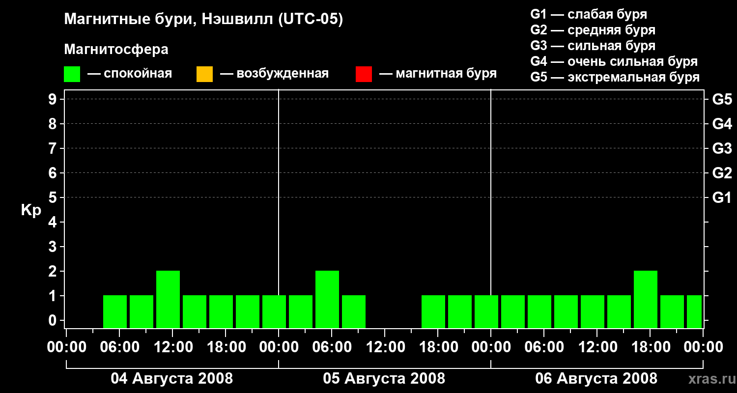 Изменения геомагнитного индекса Kp с 4 по 6 августа 2008 года для средних широт