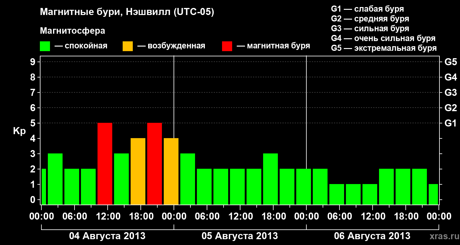 Изменения геомагнитного индекса Kp с 4 по 6 августа 2013 года для средних широт