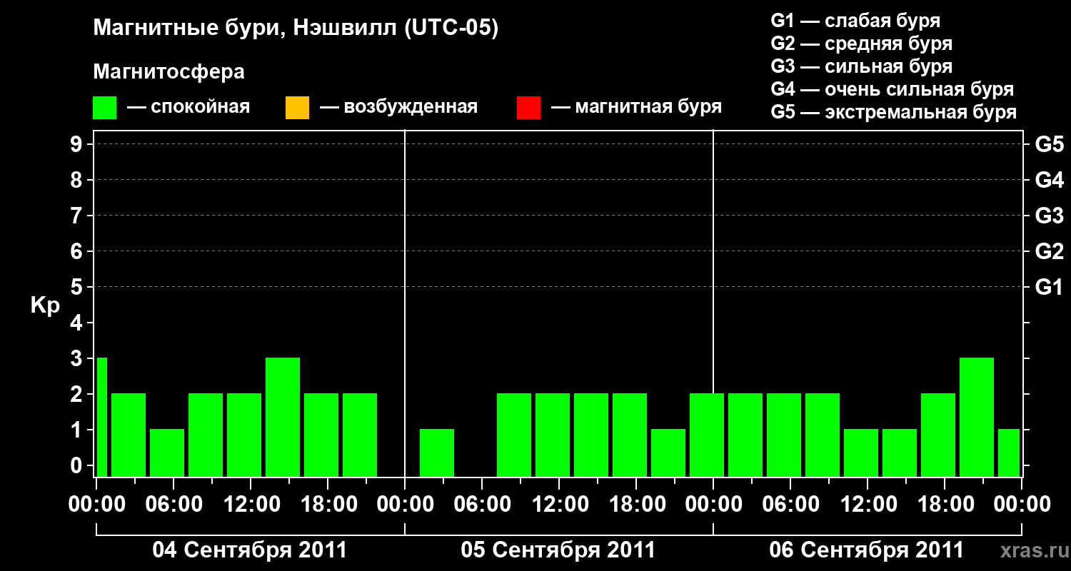 Изменения геомагнитного индекса Kp с 4 по 6 сентября 2011 года для средних широт