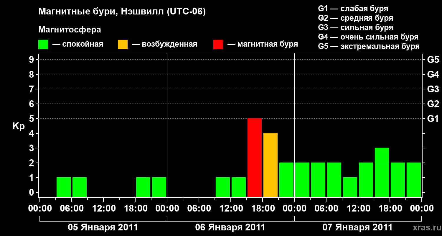 Изменения геомагнитного индекса Kp с 5 по 7 января 2011 года для средних широт