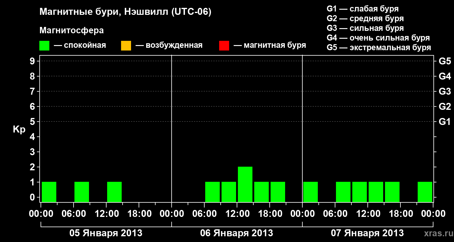 Изменения геомагнитного индекса Kp с 5 по 7 января 2013 года для средних широт