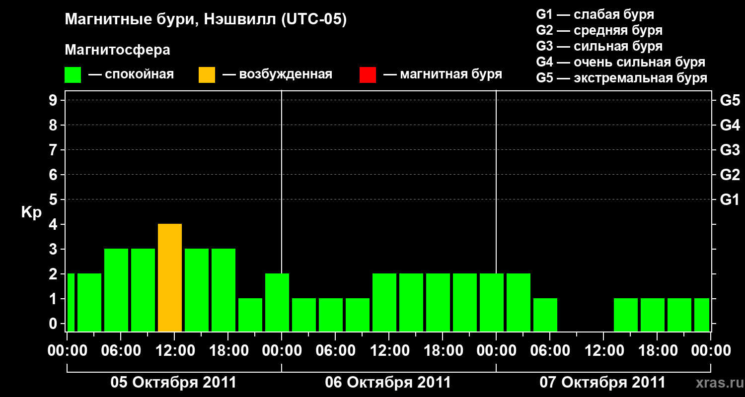 Изменения геомагнитного индекса Kp с 5 по 7 октября 2011 года для средних широт