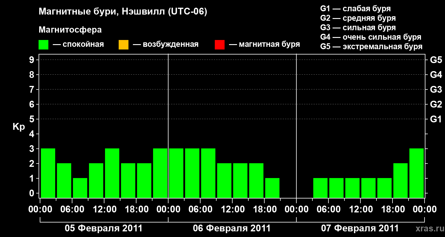 Изменения геомагнитного индекса Kp с 5 по 7 февраля 2011 года для средних широт