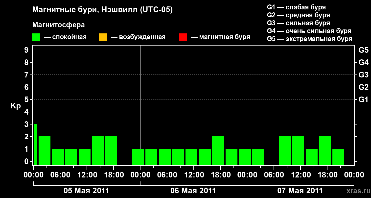 Изменения геомагнитного индекса Kp с 5 по 7 мая 2011 года для средних широт