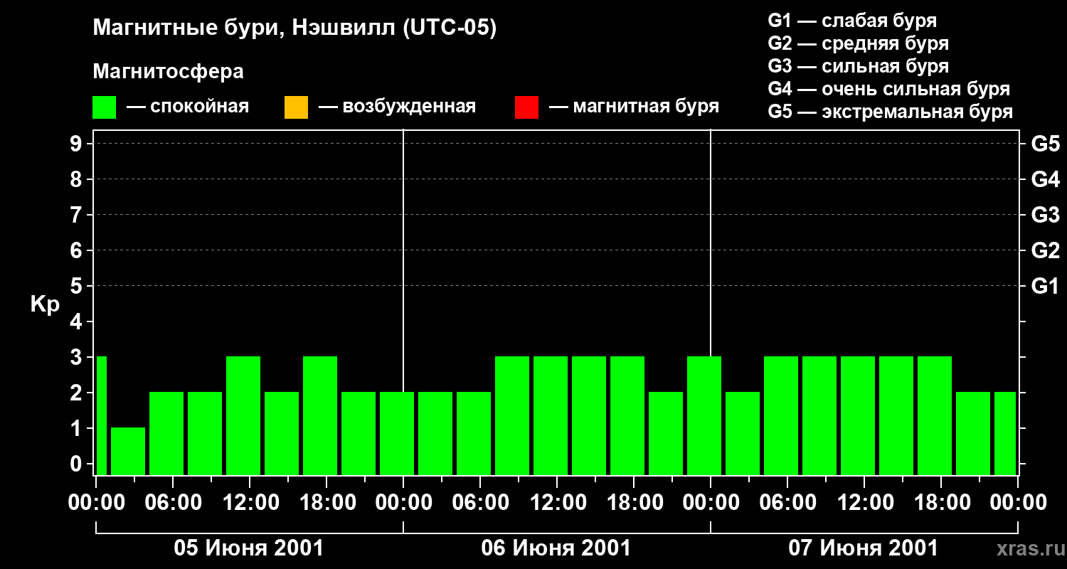 Изменения геомагнитного индекса Kp с 5 по 7 июня 2001 года для средних широт