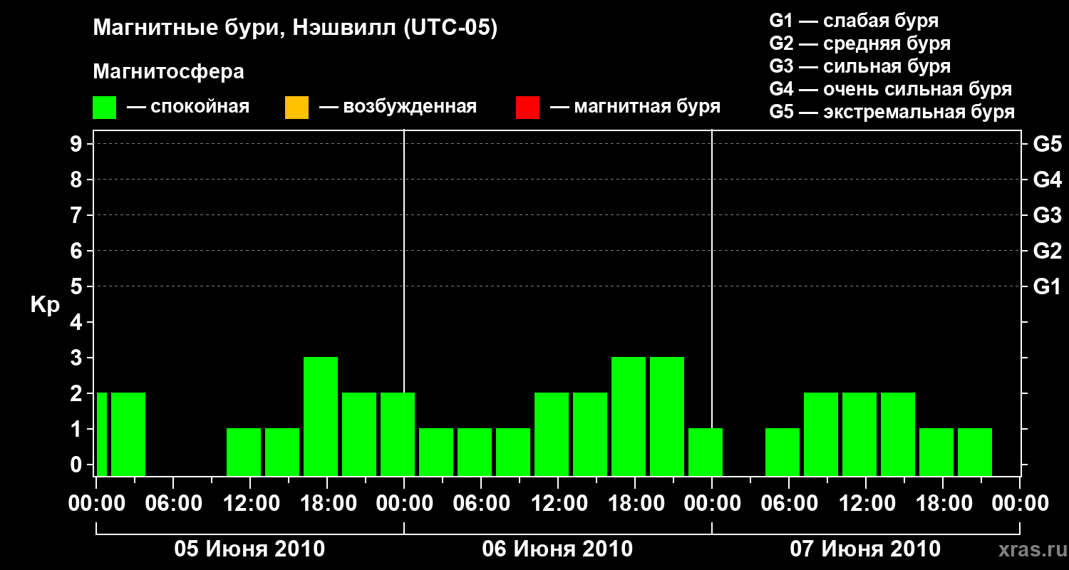 Изменения геомагнитного индекса Kp с 5 по 7 июня 2010 года для средних широт