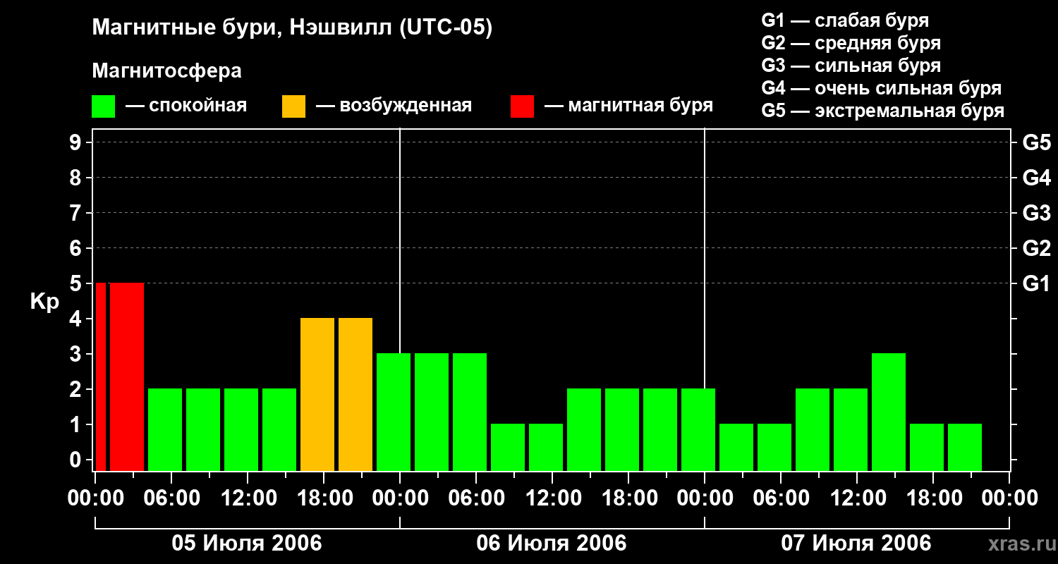 Изменения геомагнитного индекса Kp с 5 по 7 июля 2006 года для средних широт