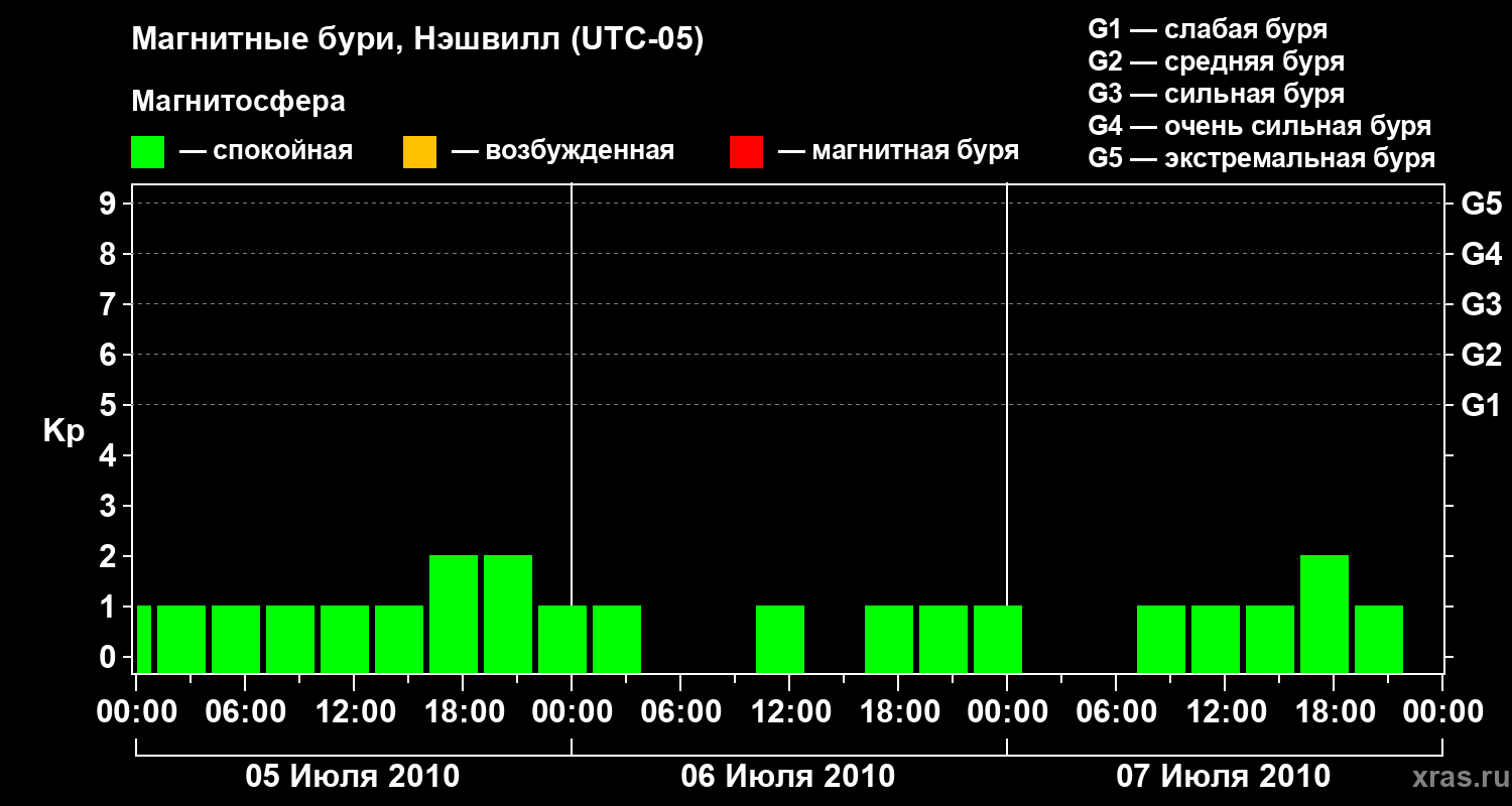 Изменения геомагнитного индекса Kp с 5 по 7 июля 2010 года для средних широт
