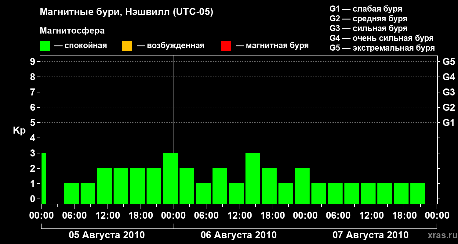 Изменения геомагнитного индекса Kp с 5 по 7 августа 2010 года для средних широт