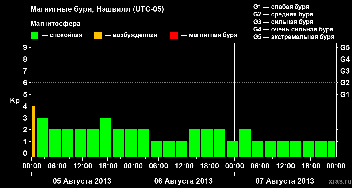 Изменения геомагнитного индекса Kp с 5 по 7 августа 2013 года для средних широт