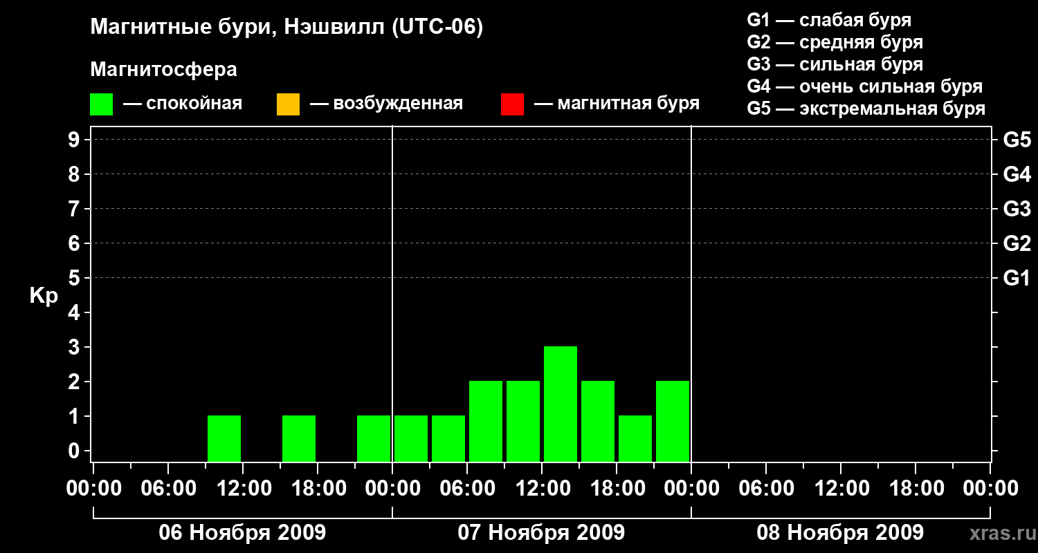 Изменения геомагнитного индекса Kp с 6 по 8 ноября 2009 года для средних широт