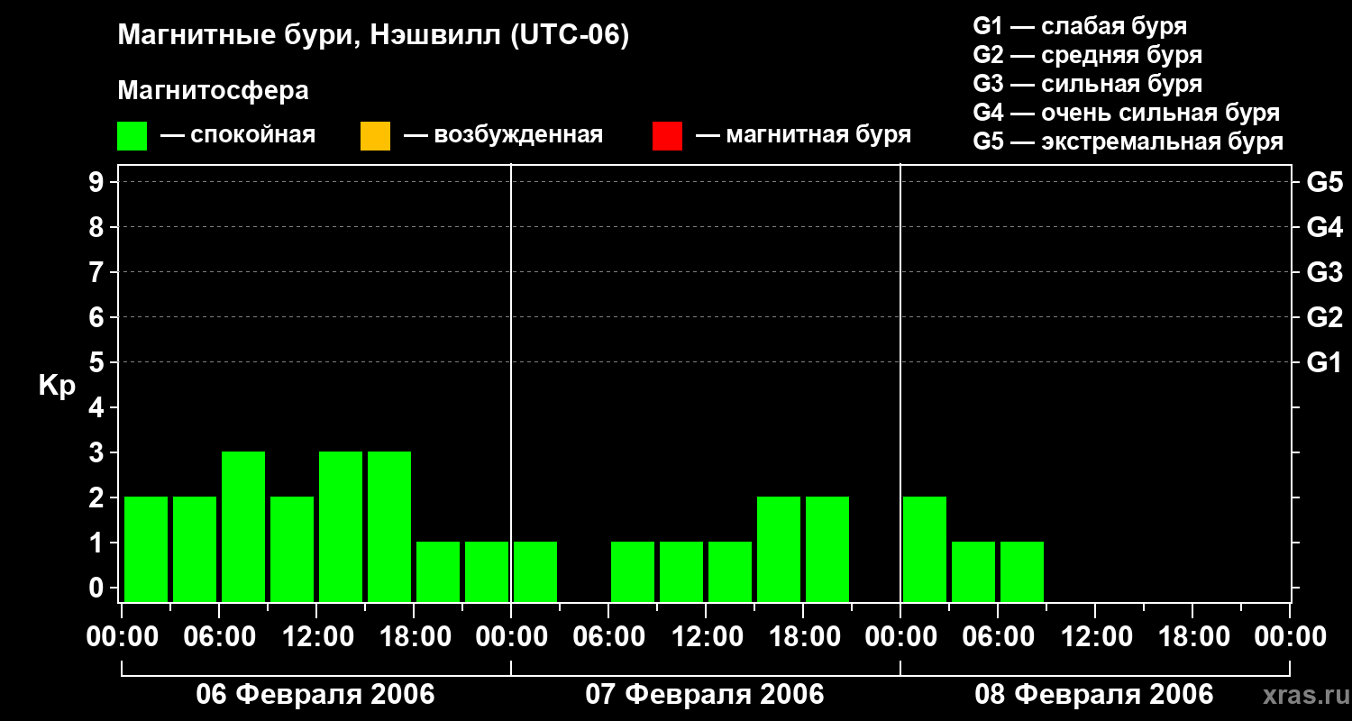Изменения геомагнитного индекса Kp с 6 по 8 февраля 2006 года для средних широт