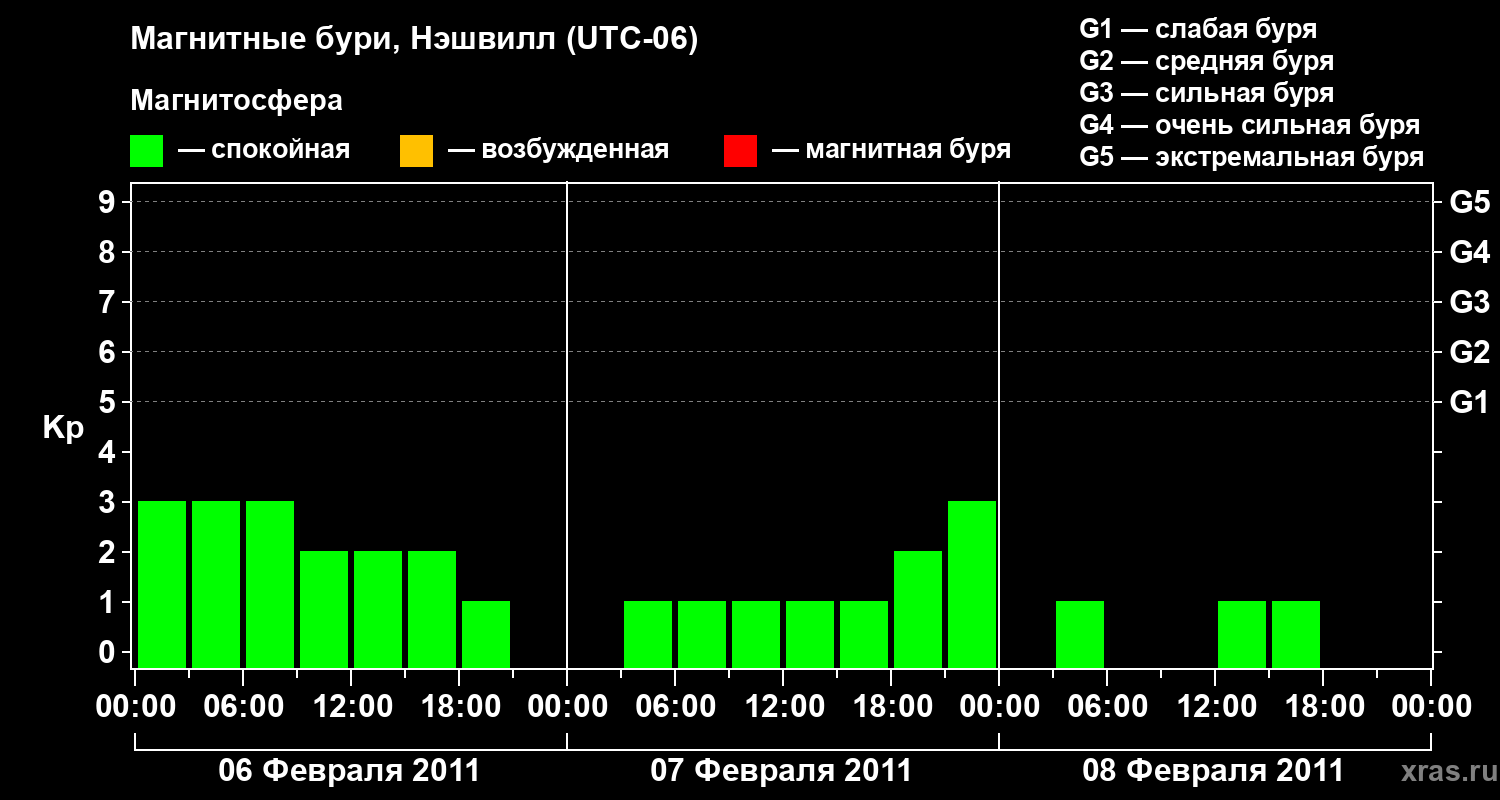 Изменения геомагнитного индекса Kp с 6 по 8 февраля 2011 года для средних широт