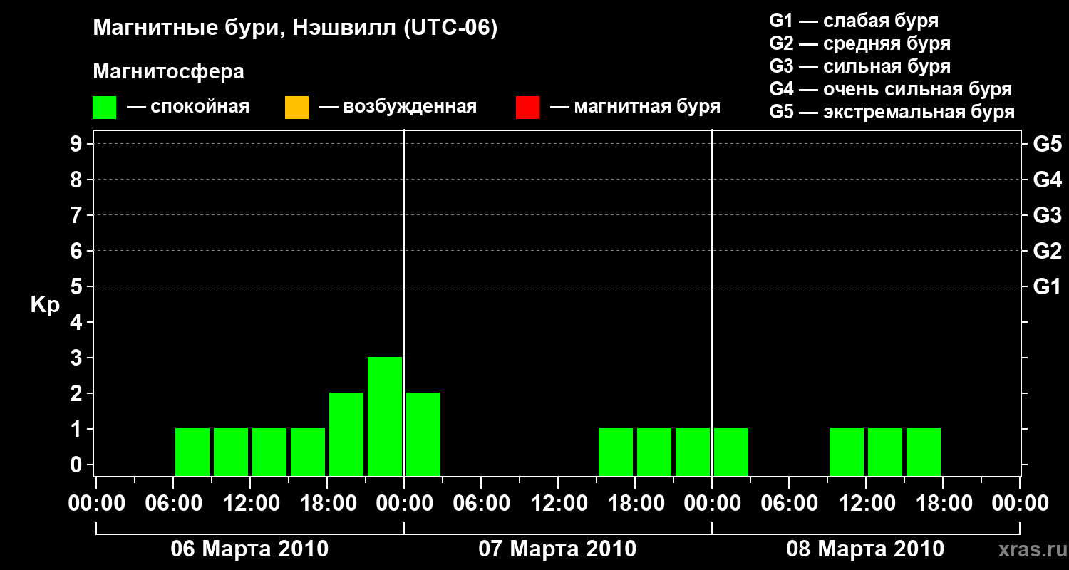 Изменения геомагнитного индекса Kp с 6 по 8 марта 2010 года для средних широт