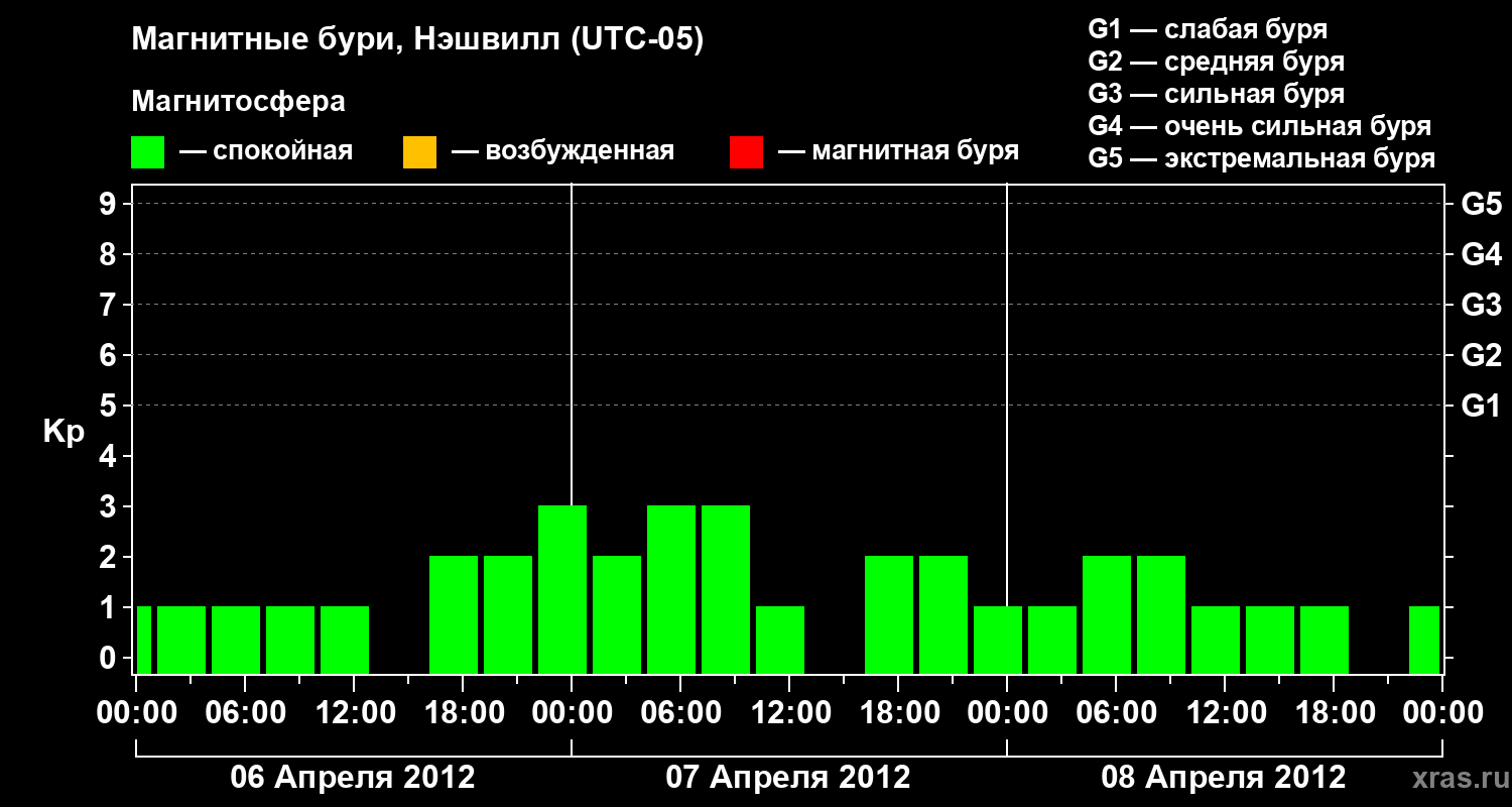 Изменения геомагнитного индекса Kp с 6 по 8 апреля 2012 года для средних широт