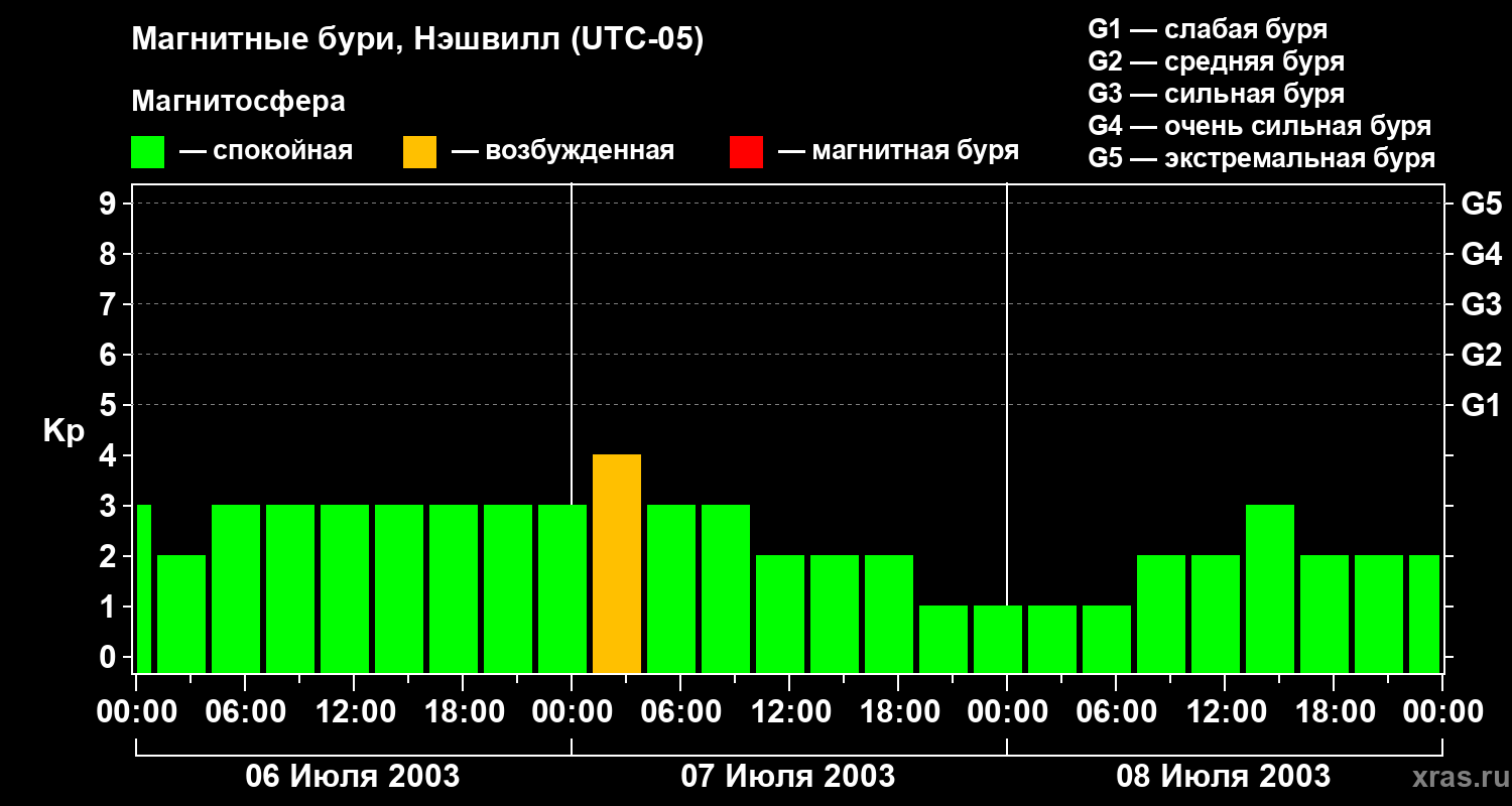 Изменения геомагнитного индекса Kp с 6 по 8 июля 2003 года для средних широт