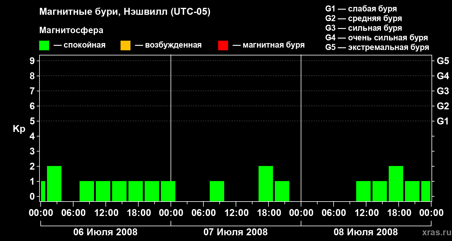Изменения геомагнитного индекса Kp с 6 по 8 июля 2008 года для средних широт
