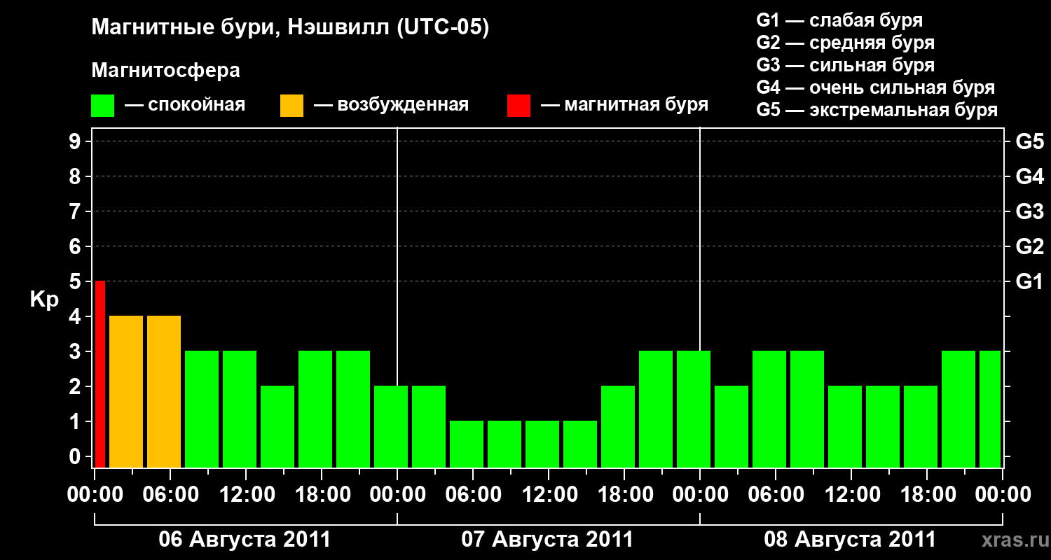 Изменения геомагнитного индекса Kp с 6 по 8 августа 2011 года для средних широт